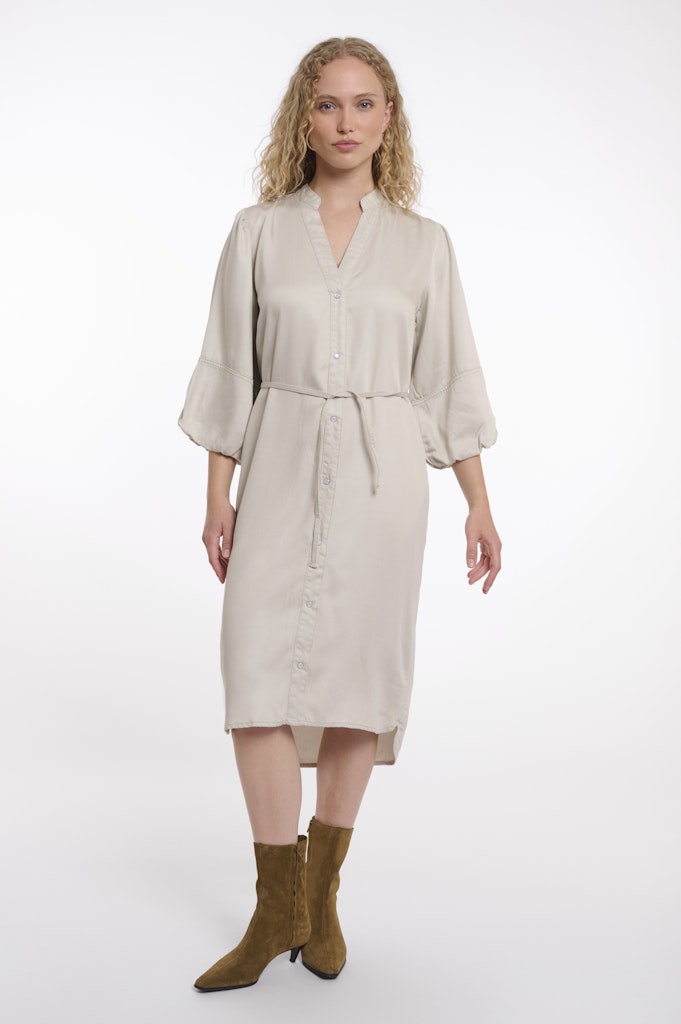 Jurk van Rino & Pelle met driekwart pofmouwen, opstaande kraag, V-hals, strikkoord in de taille en een iets langere achterzijde. Materiaal: Lyocell 100%