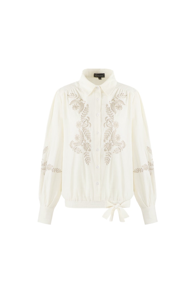 Blouse van Gmaxx met borduursels, lange mouwen, klassieke kraag, knoopsluiting en elastische taille voorzien van strikdetail. Materiaal: Katoen 100%