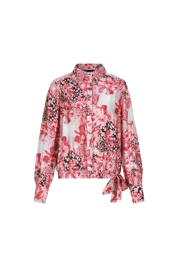 Blouse van Gmaxx uit de Froukje collectie in een all-over dessin met lange mouwen, klassieke kraag, knoopsluiting en elastische tailleband voorzien van strikdetail.