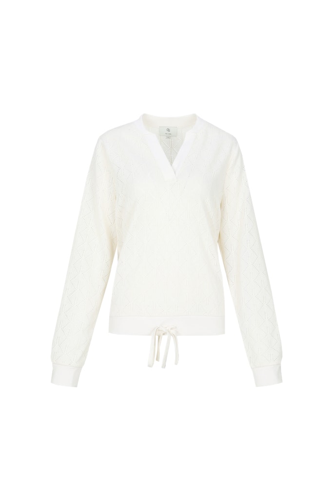 Top van C&S The Label in een subtiel opengewerkt dessin met lange mouwen, V-hals en een trekkoord in de zoom. Materiaal: Polyester 97%| elastan 3%