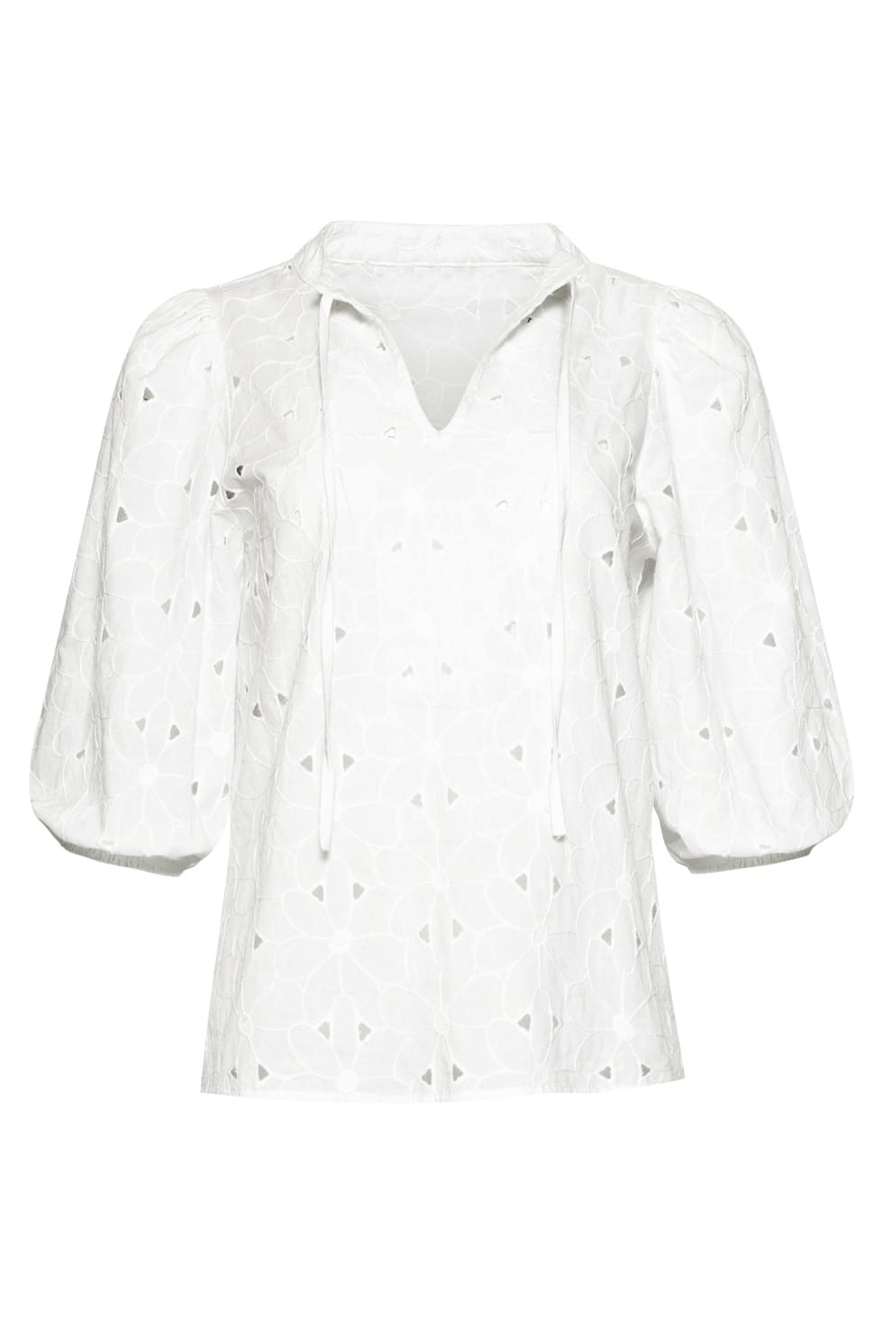 Broderie blouse van Smahed Lemon met halflange pofmouwen, opstaande kraag voorzien van strikkoordjes en een V-hals. Materiaal: Katoen 100%
