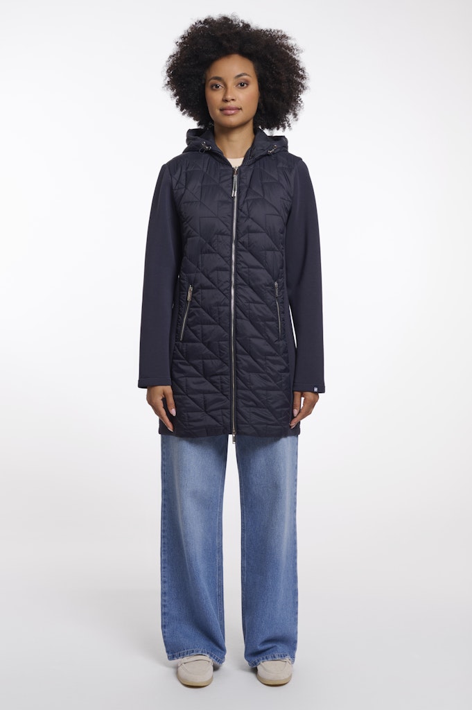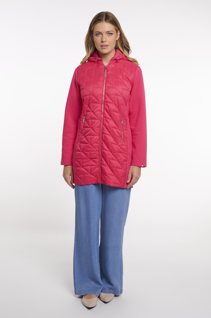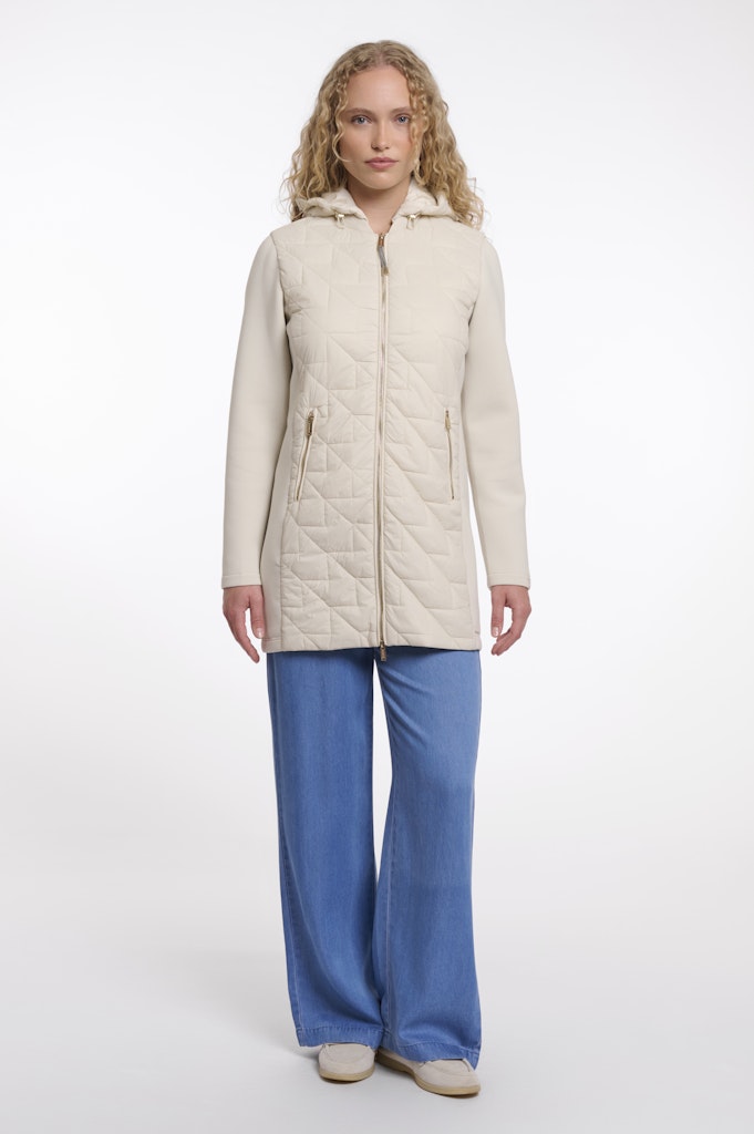 Jas van Rino & Pelle in een materialenmix met een gewatteerde voor- en achterzijde, deelbare ritssluiting, capuchon voorzien van drawstring en twee ritszakken.