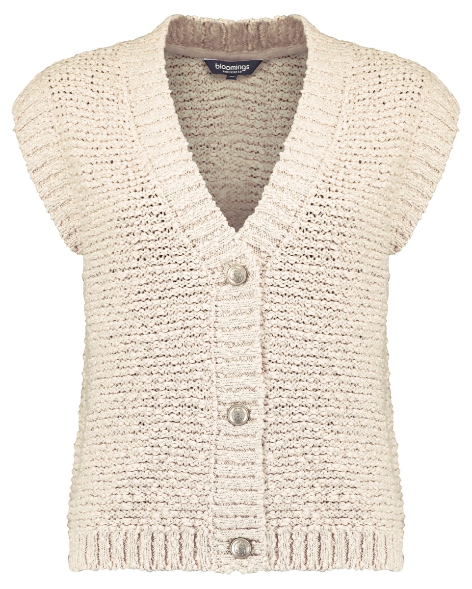 Grof gebreid gilet van Bloomings met een subtiele glans, knoopsluiting, V-hals en ribgebreide boorden. Materiaal: Katoen 86%| metallic 14%