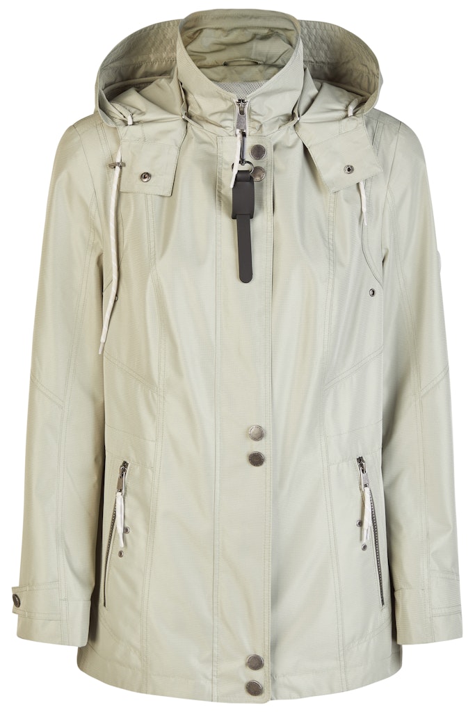 Lichtgewicht jas van Lebek met een verborgen drukknoop- en ritssluiting, opstaande kraag, afneembare capuchon voorzien van trekkoord, twee ritszakken en verstelbare manchetten.