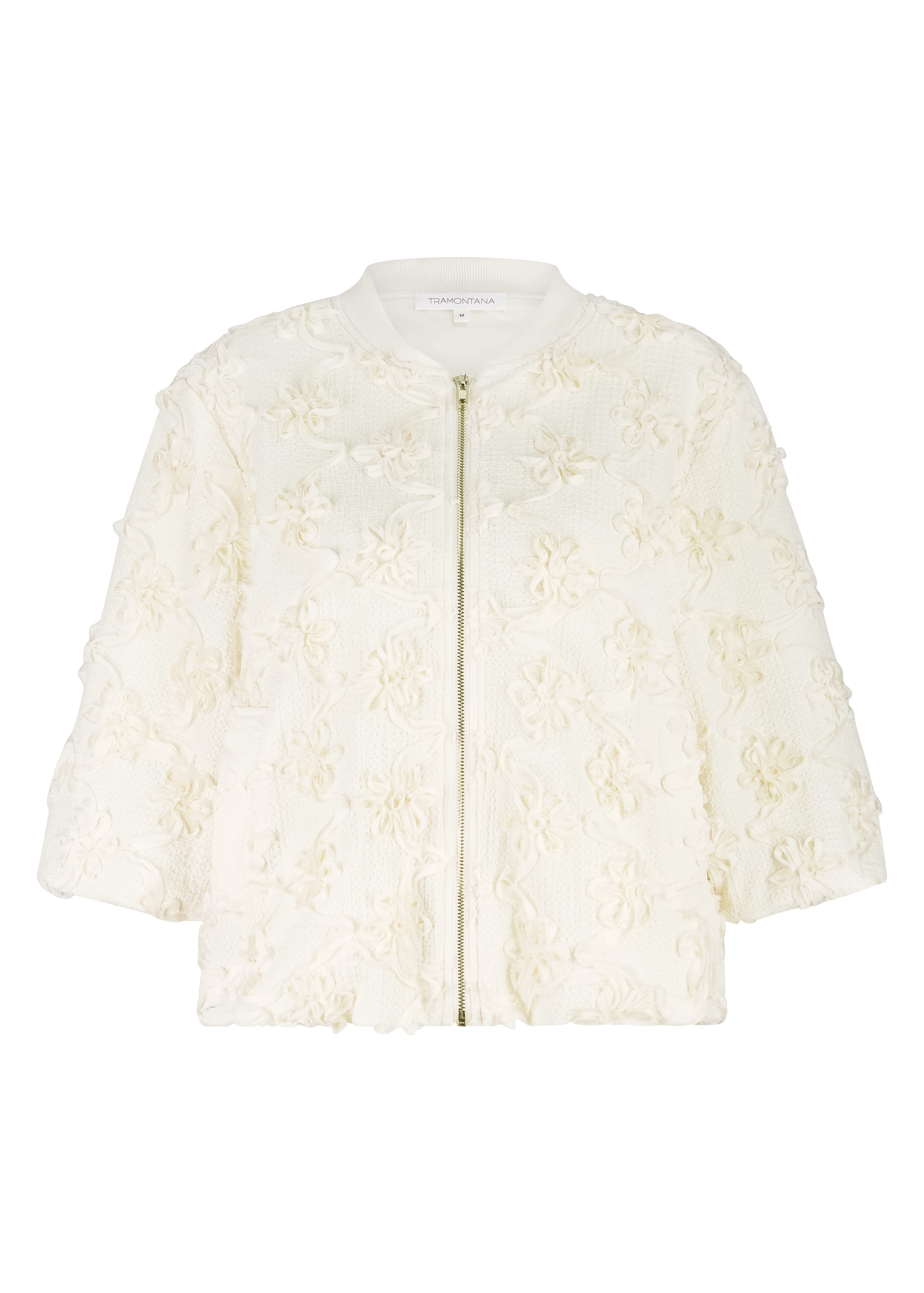 Jacket van Tramontana in een 3D bloemen print met driekwart pofmouwen, opstaande kraag en een ritssluiting. Materiaal: Polyester 95%| elastan 5%