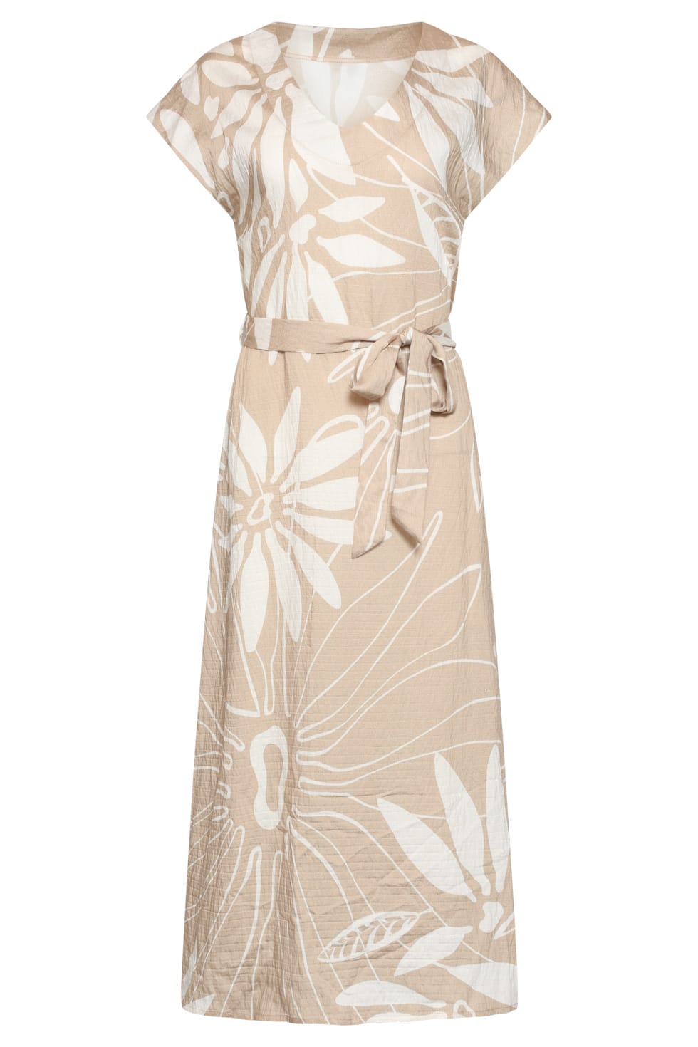Jurk van Smashed Lemon in een all-over dessin met korte kapmouwen, V-hals en strikceintuur. Materiaal: Rayon 85%| polyamide 15%