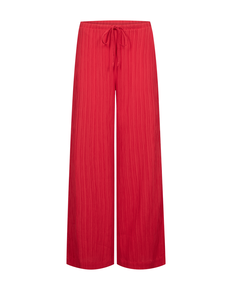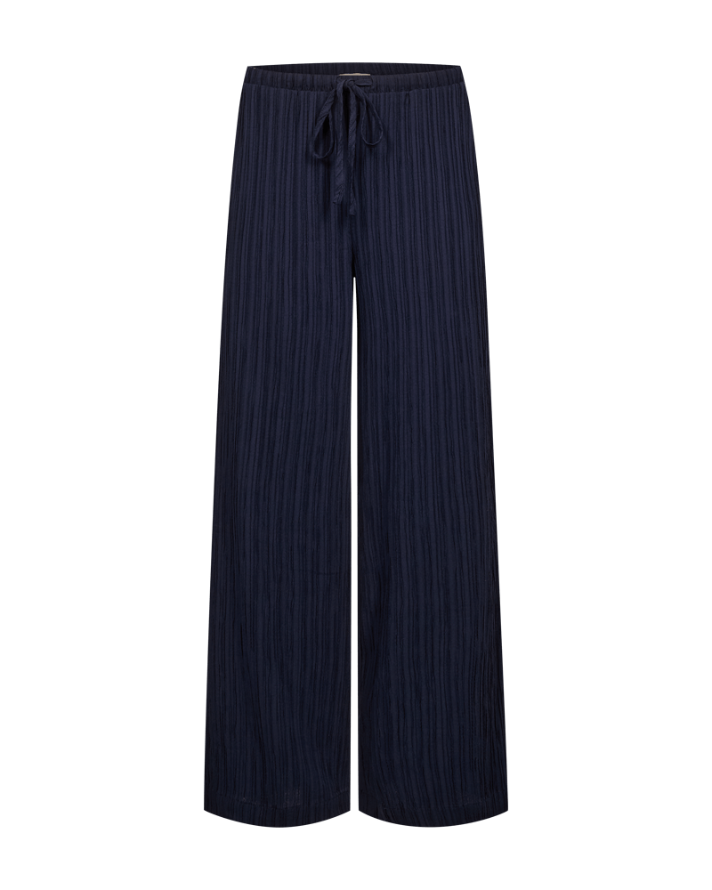 Broek van Freequent in een structuur dessin met wijde pijpen, steekzakken en een elastische tailleband vooorzien van trekkoord. Materiaal: Polyester 55%| viscose 43%| elastan 2%