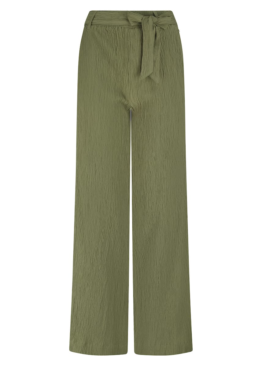 Broek van Tramontana in een structuur dessin met wijde pijpen, steekzakken, twee paspelzakken aan de achterzijde en een elastische tailleband voorzien van strikceintuur.