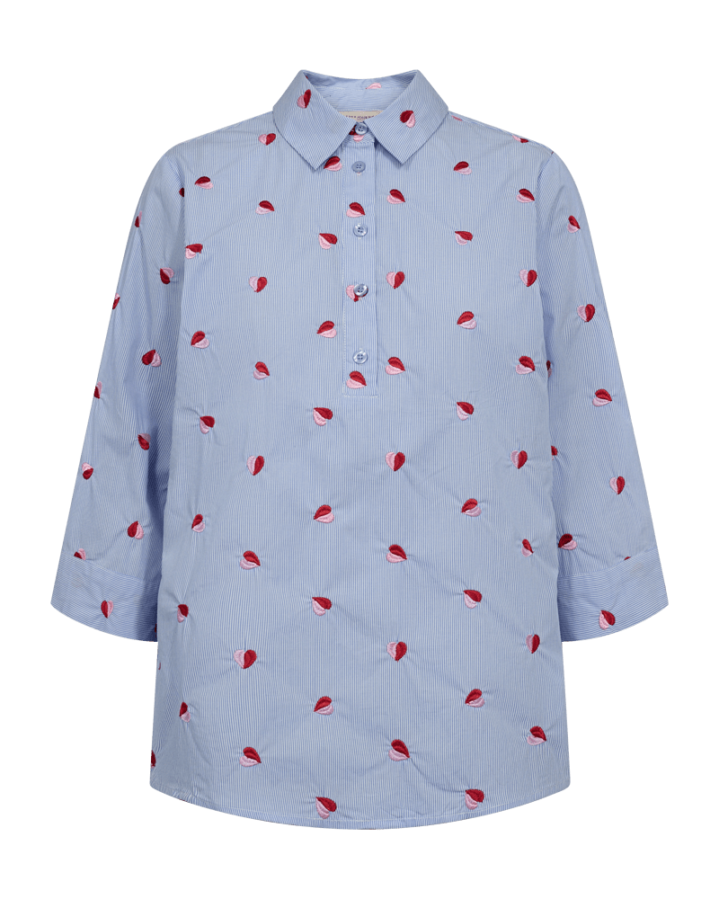 Gestreepte blouse van Freequent met een all-over speelse print, driekwart mouwen, kraag en een halve knoopsluiting. Materiaal: Bio katoen 100%
