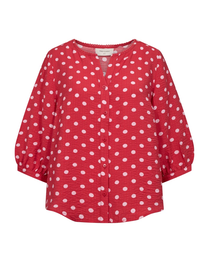 Blouse van Freequent in een stippen dessin met driekwart pofmouwen, V hals en een knoopsluiting. Materiaal: Eco viscose 80%| polyamide 20%