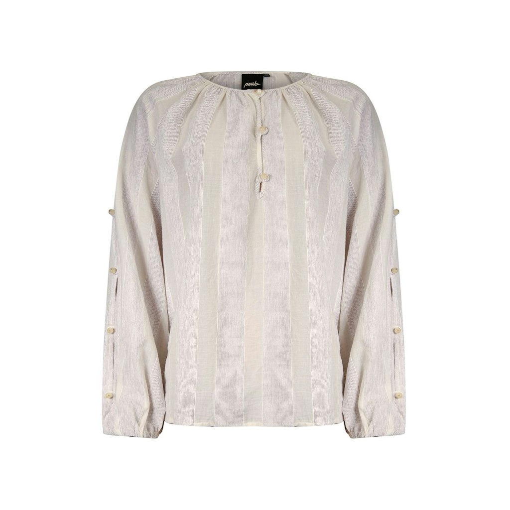Soepelvallende blouse van Poools met subtiele strepen, ronde hals voorzien van korte knoopsluiting en raglanmouwen met knoopdetail voor een speelse twist.