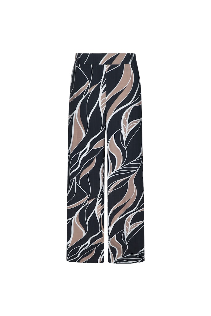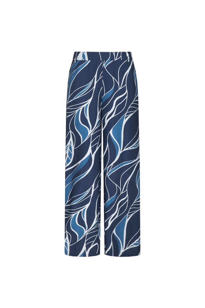 Broek van C&S The Label in een all-over dessin met wijde pijpen, steekzakken, paspelzakken aan de achterzijde en een elastische tailleband. Materiaal: Viscose 88%| polyamide 12%