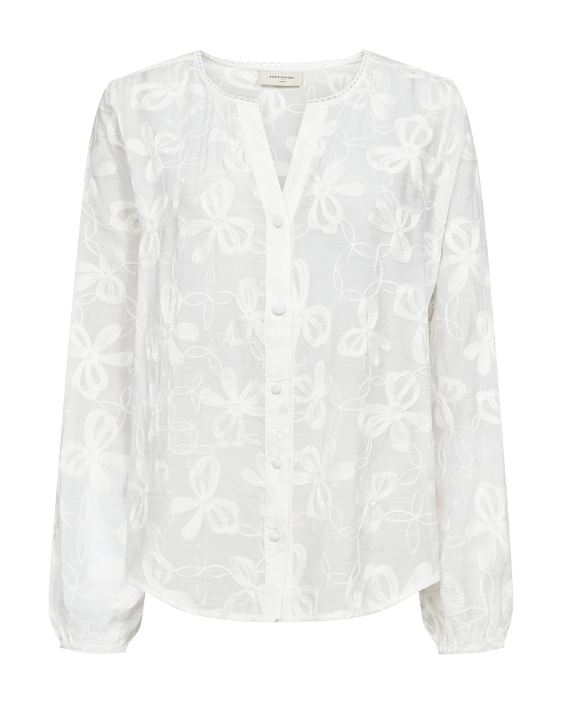 Blouse van Freequent met borduursels, lange mouwen voorzien van elastische boorden, knoopsluiting en V-hals. Materiaal: Viscose 93%| polyamide 7%