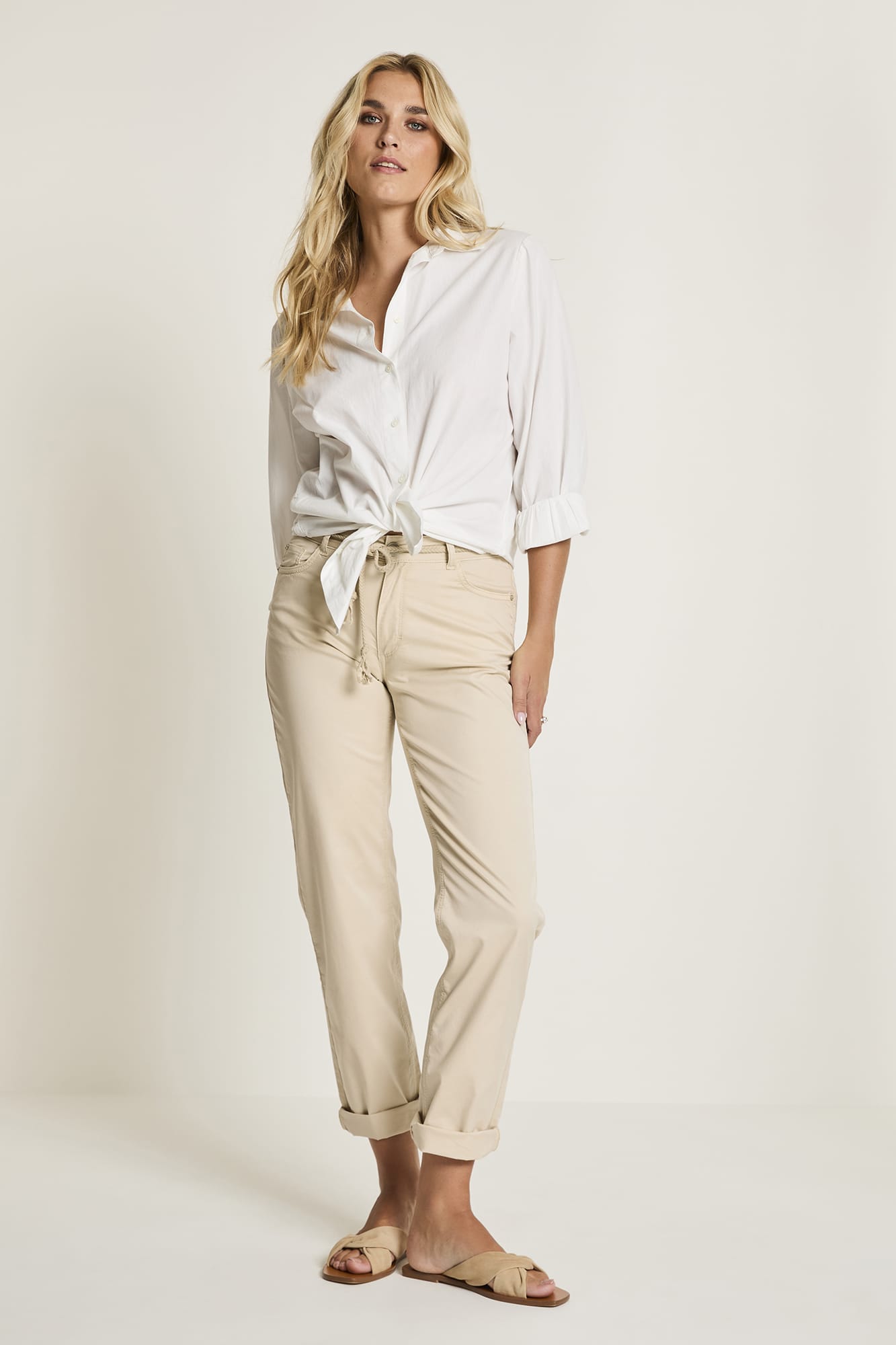 Enkellange 5-pocket broek van Para Mi met een hoge taille, knoop- en ritssluiting, strikkoord in de taille en een omgeslagen zoom.