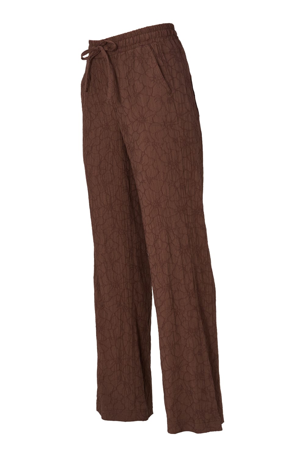 Broek van Dreamstar in een structuur dessin met wijde pijpen, steekzakken en een elastische tailleband voorzien van trekkoord. Materiaal: Viscose 725| polyamide 25%| elastan 3%