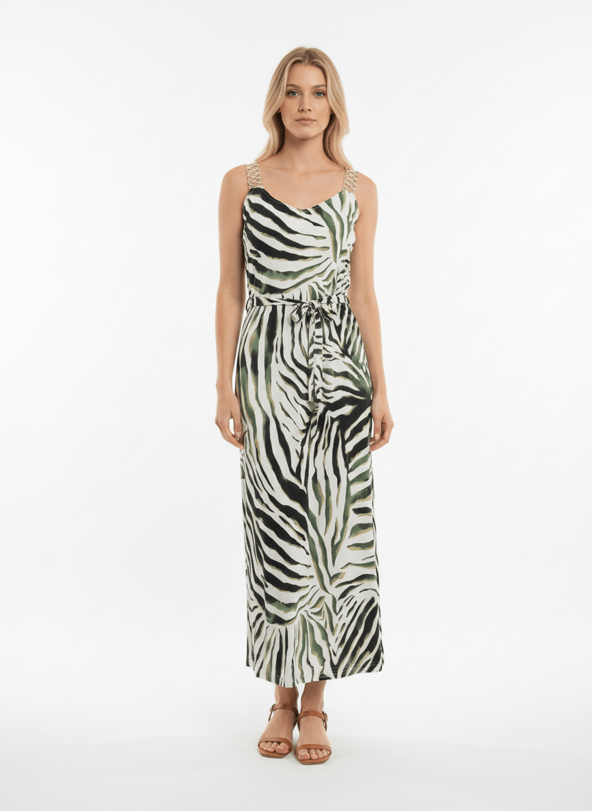 Mouwloze jurk van Batida in een all-over dessin met een V-hals, contrasterende bandjes, zijsplitten en een strikceintuur in de taille.