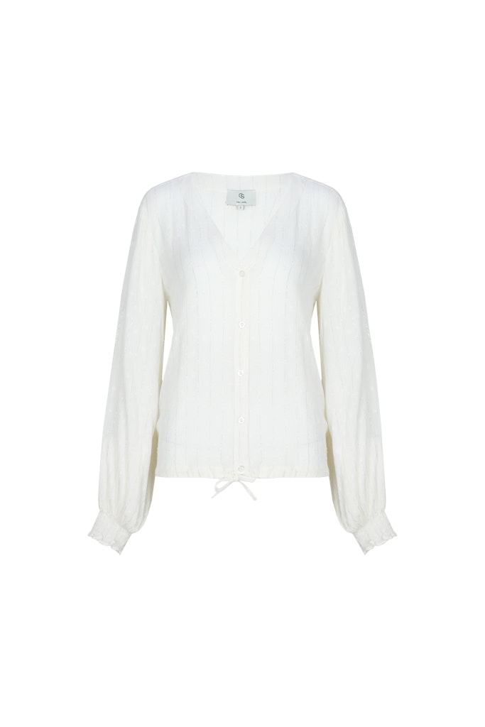 Blouse van C&S The Label in een structuur dessin met lange pofmouwen voorzien van gesmokte manchetten, V-hals, knoopsluiting en een trekkoord in de zoom.