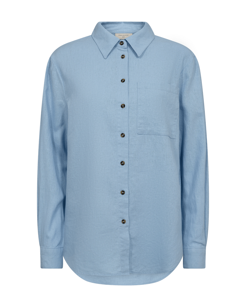 Blouse van Freequent met lange mouwen, kraag, knoopsluiting, opgestikte borstzak en plooi aan de achterzijde. Materiaal: Linnen 55%| viscose 45%