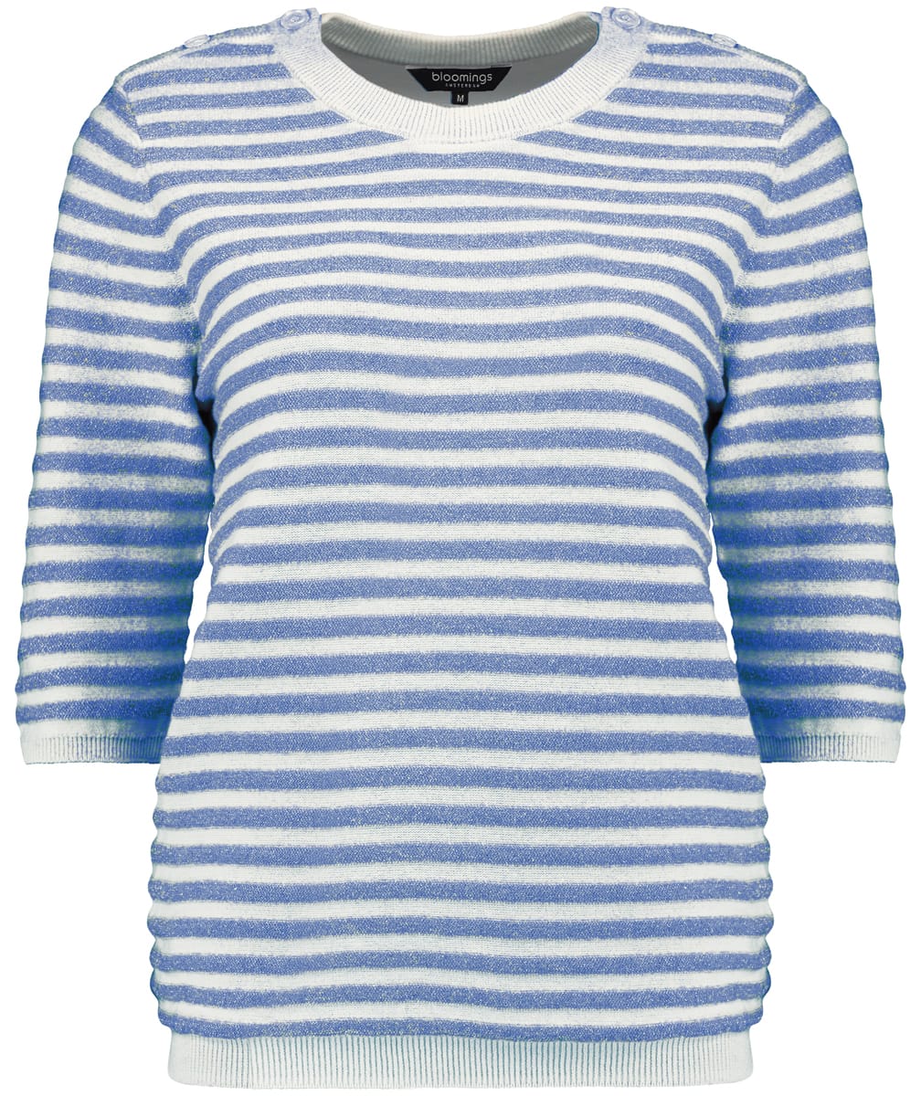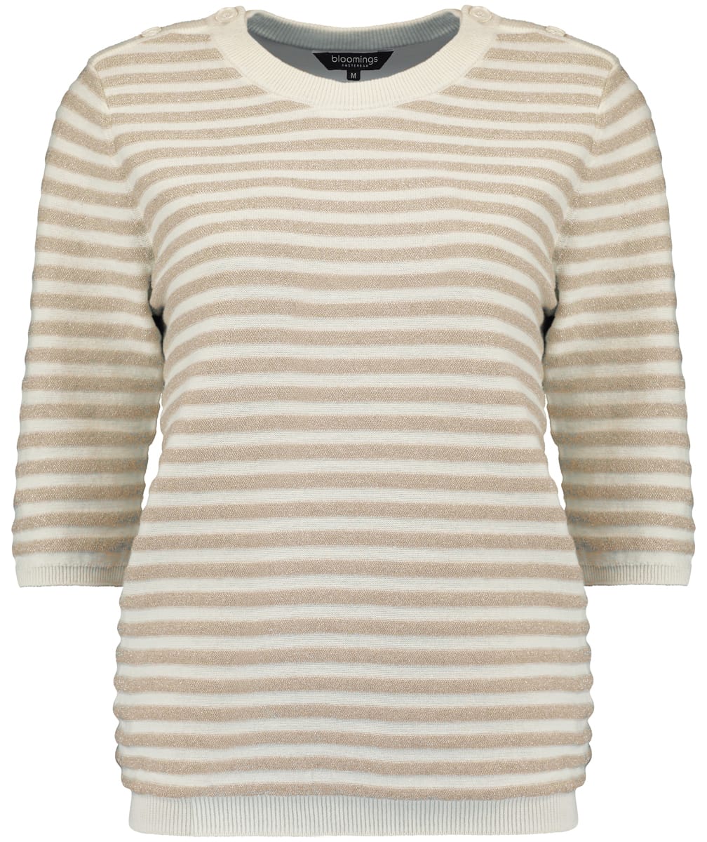 Trui van Bloomings met lurex strepen, driekwart mouwen, ronde hals, sierknopen op de schouders en ribgebreide boorden.
