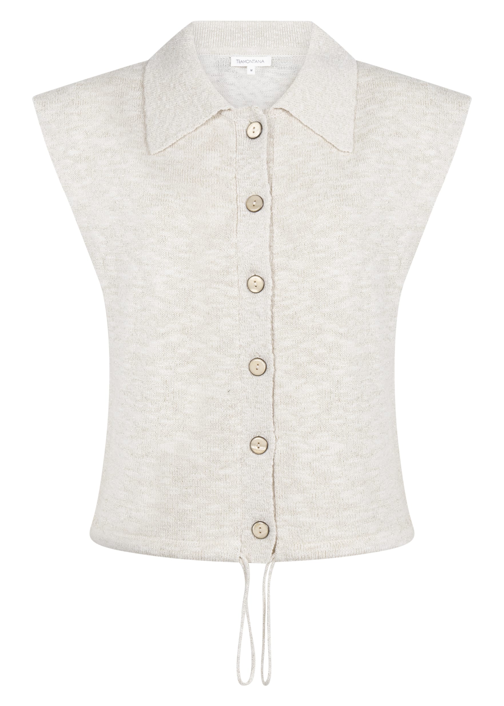 Mouwloos vest van Tramontana met een subtiele glansdraad erin verwerkt, knoopsluiting, kraag en tunnelkoord aan de onderzijde. Materiaal: Katoen 89%| metallic 11%
