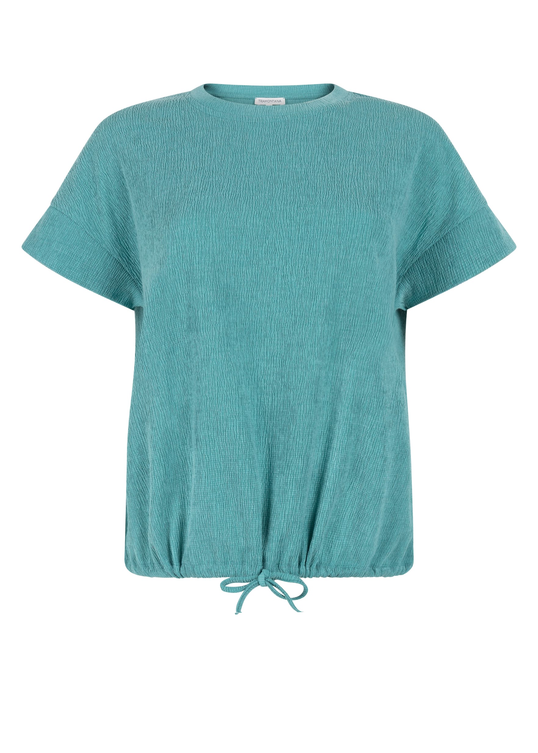 Top van Tramontana in een crinkle stof met korte mouwen, ronde hals en tunnelkoord aan de onderzijde. Materiaal: Polyester 76%| viscose 20%| elastan 4%