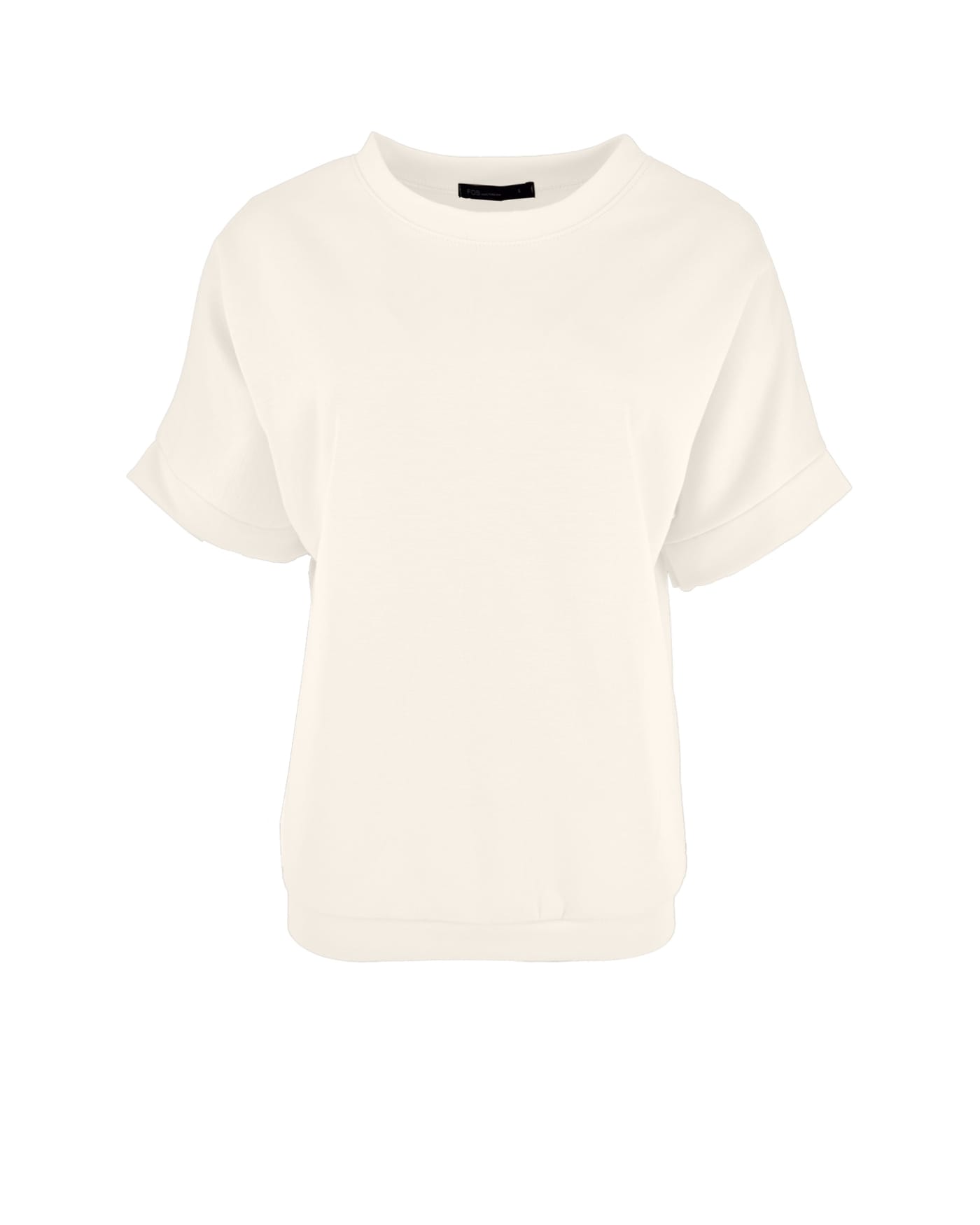 Trui van FOS Amsterdam met korte mouwen voorzien van brede boorden, ronde hals en elastische tailleband. Materiaal: Viscose 50%| polyester 43%| elastan 7%