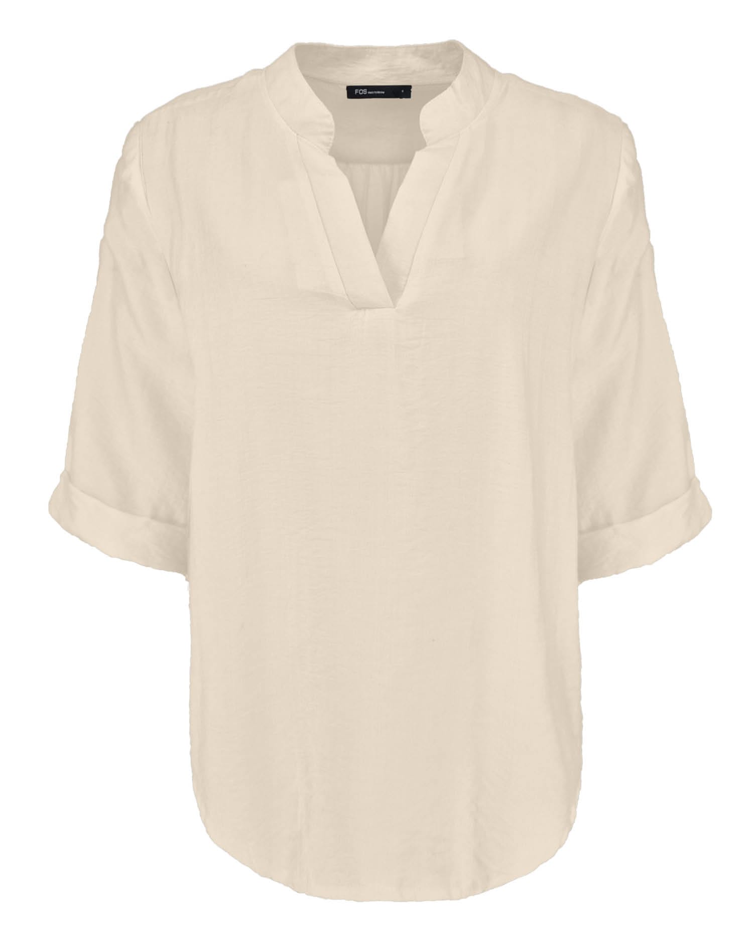 Blouse van FOS Amsterdam in een fijne structuurstof met driekwart mouwen voorzien van omslag, half opstaande kraag en V-hals. Materiaal: Viscose 87%| polyamide 13%