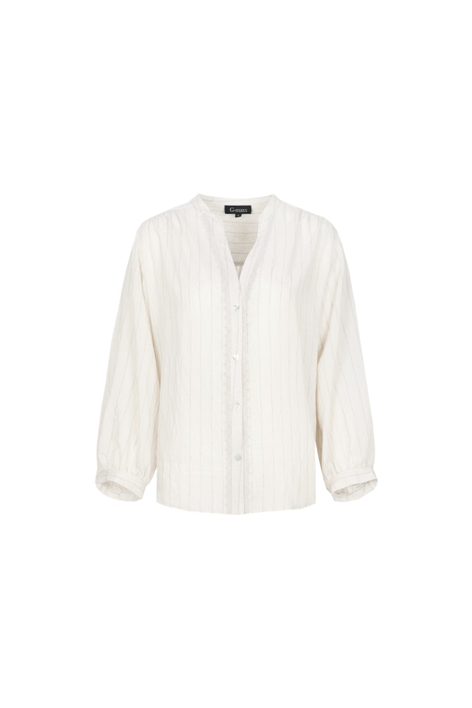 Blouse van G-maxx in een structuur dessin met lange mouwen, kraag, V-hals en een sierlijke afwerking langs de knoopsluiting. Materiaal: Rayon 74%| polyamide 22%| elastan 4%