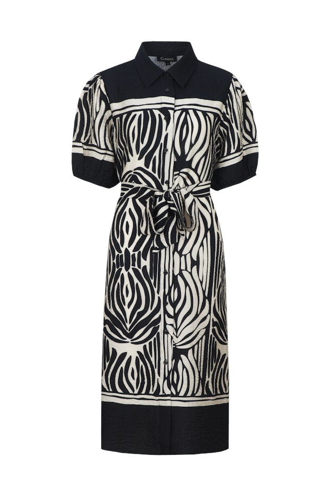Jurk van G-maxx in een grafisch dessin met halflange pofmouwen, kraag, doorlopende knoopsluiting en een strikceintuur in de taille.