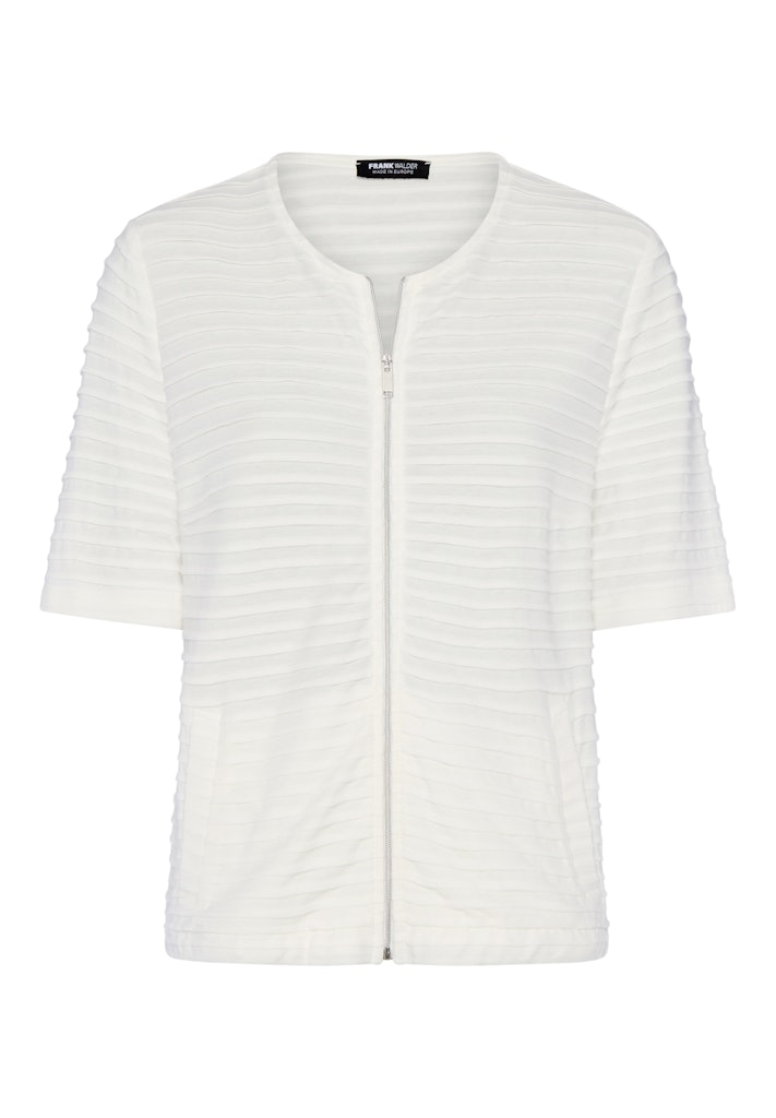 Vest van Frank Walder in een gestreept structuur dessin met halflange mouwen, ronde hals, steekzakken en een ritssluiting.