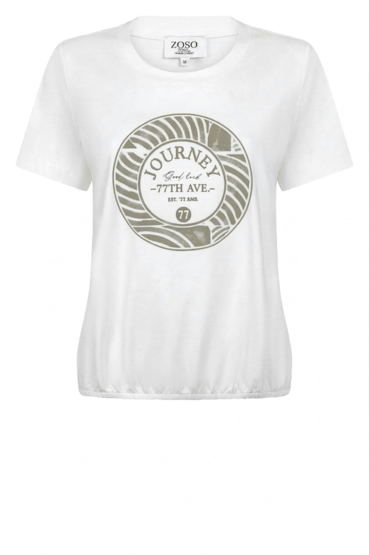 T-shirt van Zoso met korte mouwen, ronde hals, ronde grafische print aan de voorzijde en een elastische zoom. Materiaal: Katoen 95%| elastan 5%