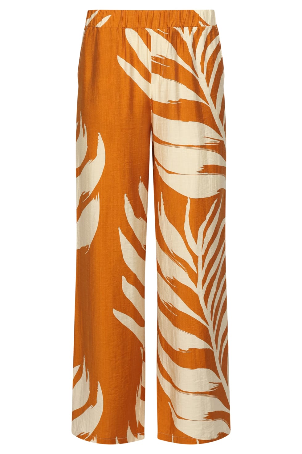 Broek van Smashed Lemon in een bladeren dessin met wijde pijpen en een elastische taillleband.