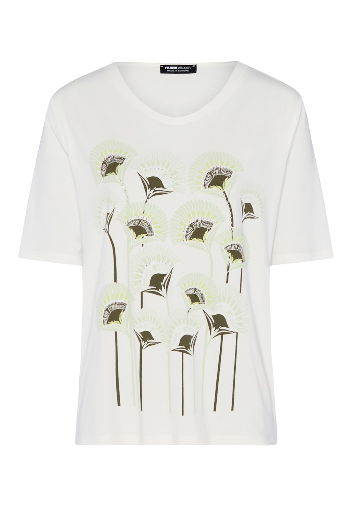 Shirt van Frank Walder met korte mouwen, ronde hals en een bloemen print aan de voorzijde. Materiaal: Katoen 45%| modal 45%| elastan 10%