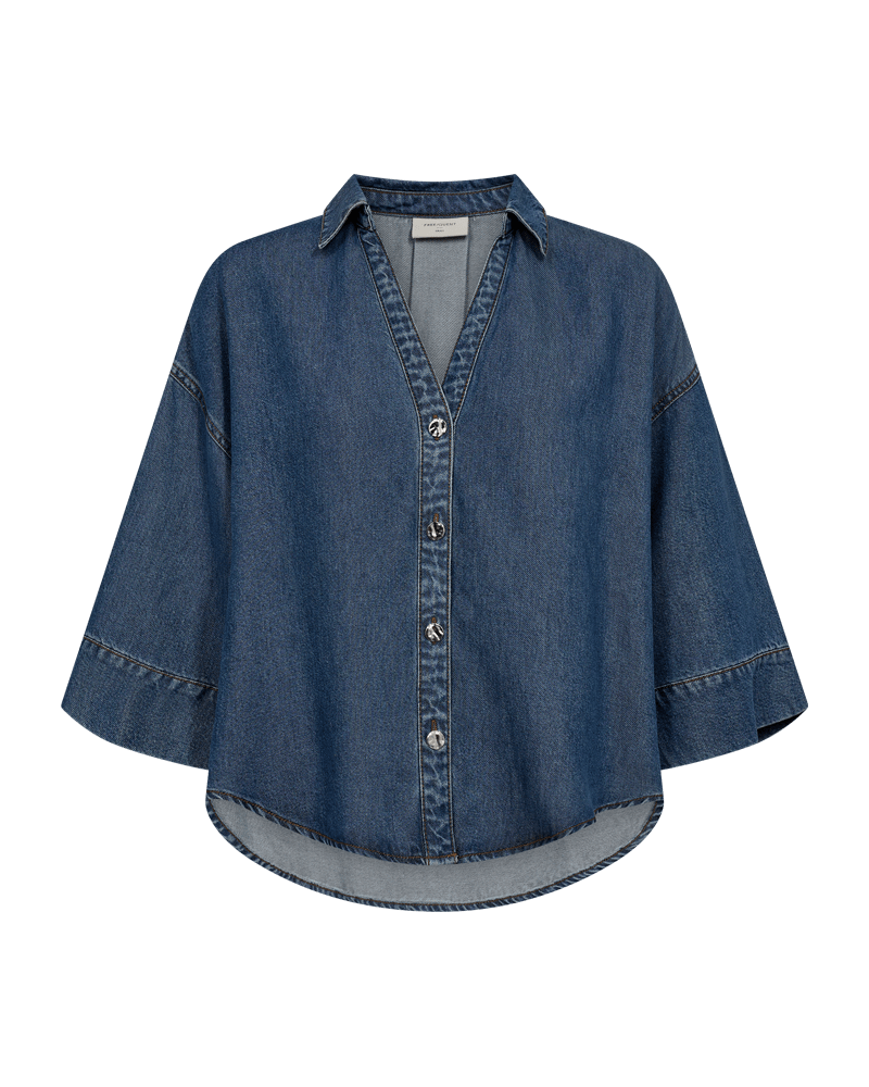 Denim blouse van Freequent met driekwart mouwen, verlaagde schoudernaden, knoopsluiting en V-hals voorzien van kraag. Materiaal: Lyocell 100%