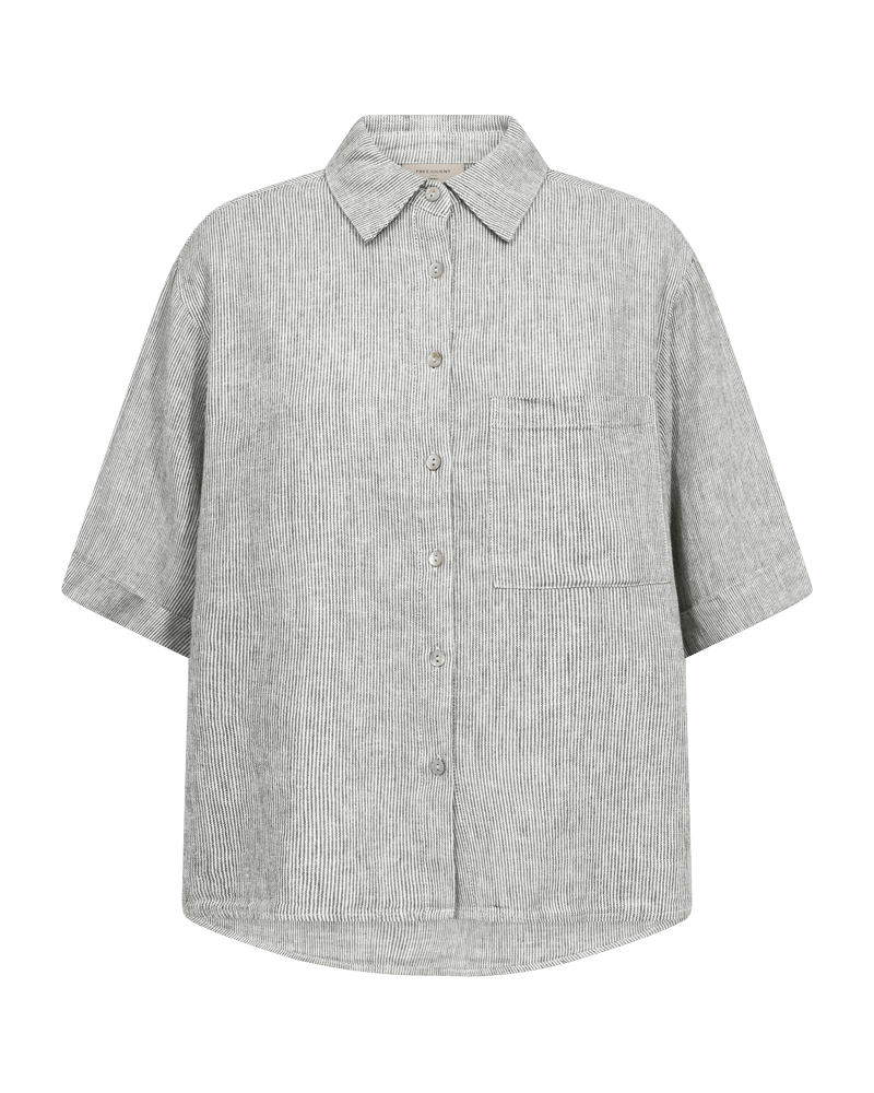Fijn gestreepte blouse van Freequent met halflange mouwen, kraag, knoopsluiting, opgestikte borstzak en plooi aan de achterzijde.